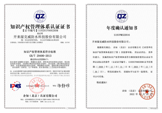 經(jīng)過企知(北京)認(rèn)證公司的審核,于2020年12月31日獲得《知識(shí)產(chǎn)權(quán)管理體系認(rèn)證證書》。2022年1月29日,企知(北京)認(rèn)證公司對(duì)該體系又做了復(fù)審,并頒發(fā)了《年度確認(rèn)通知書》,該證書的獲得,標(biāo)志著開來濕克威防水科技股份有限公司向知識(shí)化、數(shù)字化發(fā)展的方向上又進(jìn)了一步。