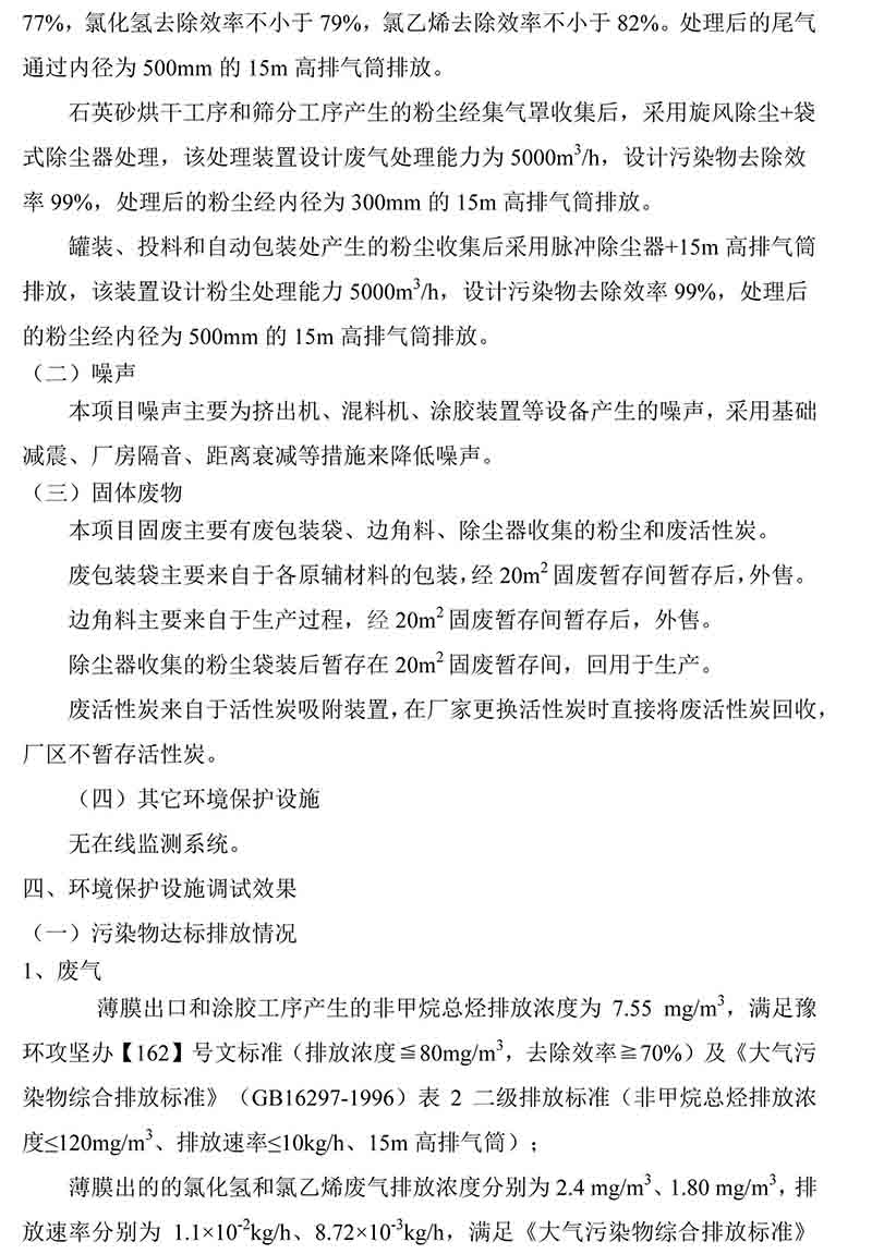 我公司建筑防水新材料建設(shè)項(xiàng)目于2015年12月在新鄉(xiāng)縣發(fā)改委備案,2016年6月通過新鄉(xiāng)市環(huán)境保護(hù)局審查,取得環(huán)評批復(fù);2016年6月一期工程開始建設(shè),2017年7月一期工程竣工。根據(jù)《建設(shè)項(xiàng)目環(huán)境保護(hù)管理?xiàng)l例》(國務(wù)院令第682號)和《關(guān)于規(guī)范建設(shè)單位自主開展建設(shè)項(xiàng)目竣工環(huán)境保護(hù)驗(yàn)收的通知》(環(huán)辦環(huán)評函[2017]1235號)等文件的要求,組織建設(shè)單位、檢測公司等單位及環(huán)保專家于2017年12月份進(jìn)行了一期工程進(jìn)行驗(yàn)收,現(xiàn)對驗(yàn)收監(jiān)測結(jié)論予以公示。